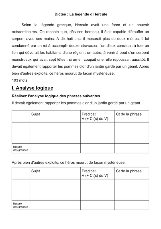 Dictée : La légende d'Hercule Selon la légende grecque, Hercule avait une force et un pouvoir extraordinaires. On raconte que, dès son berceau, il était capable d'étouffer un serpent avec ses mains. A dix-huit ans, il mesurait plus de deux mètres. Il fut condamné par un roi à accomplir douze «t...