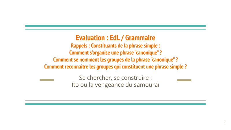 Evaluation : EdL / Grammaire Rappels : Constituants de la phrase simple : Comment s’organise une phrase “canonique” ? Comment se nomment les groupes de la phrase “canonique” ? Comment reconnaitre les groupes qui constituent une phrase simple ? Se chercher, se construire : Ito ou la vengeance du s...