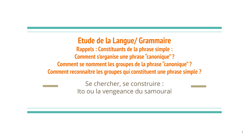 Etude de la Langue/ Grammaire Rappels : Constituants de la phrase simple : Comment s’organise une phrase “canonique” ? Comment se nomment les groupes de la phrase “canonique” ? Comment reconnaitre les groupes qui constituent une phrase simple ? Se chercher, se construire : Ito ou la vengeance du ...