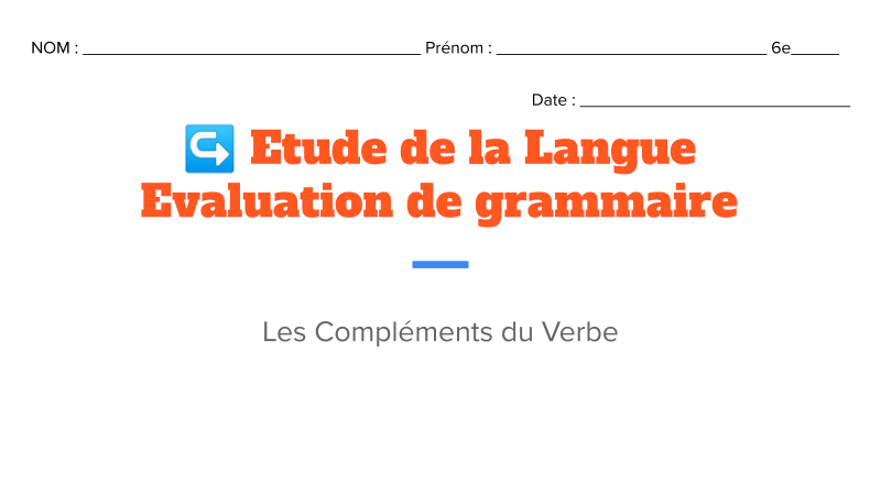 ↪ Etude de la Langue Evaluation de grammaire Les Compléments du Verbe Date : ____________________________ NOM : ___________________________________ Prénom : ____________________________ 6e_____