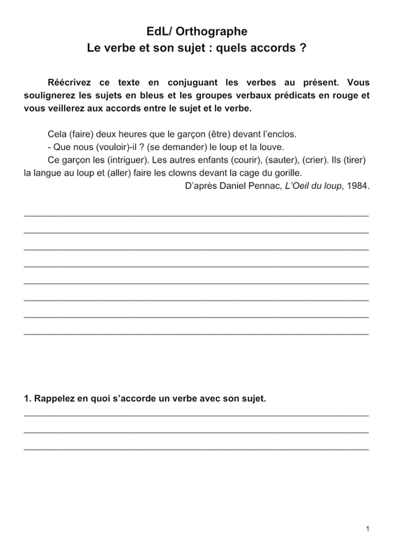 EdL/ Orthographe Le verbe et son sujet : quels accords ? Réécrivez ce texte en conjuguant les verbes au présent. Vous soulignerez les sujets en bleus et les groupes verbaux prédicats en rouge et vous veillerez aux accords entre le sujet et le verbe. Cela (faire) deux heures que le garçon (êt...